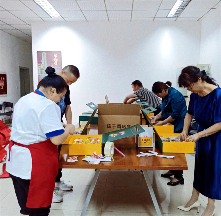 5月24日,粽子,皮蛋,咸鸭蛋陆续送达了芊村道。在公司领导的领导下,装盒事情有条不紊的进行。 “注意粽子个数,不要少装了哦。”“鲜肉粽没有了,再搬一箱过来。”打包现场好生热闹,却又不失秩序。公司领导毛总和高老师也加入了打包步队,让各人越发动力十足。礼盒于5月25日全部打包完成,并由司机陆续送往各个公司。