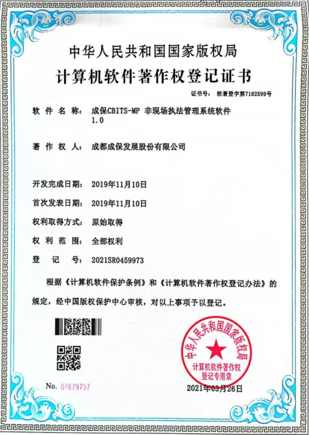 “成保CBITS—MP 非现场执法治理系统1.0 ”著作权挂号证书