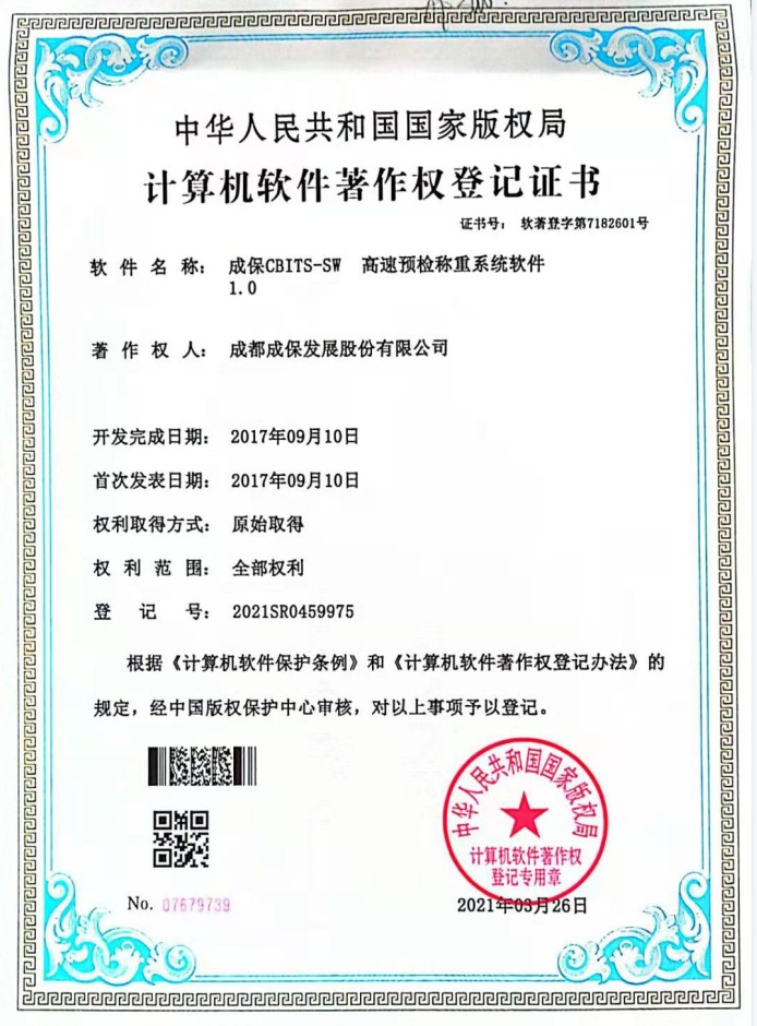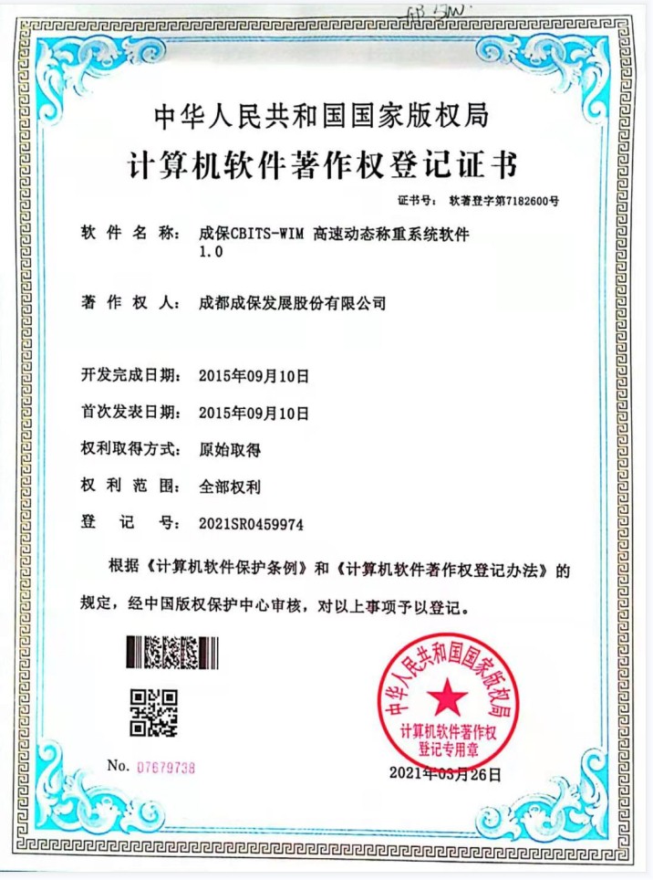“成保CBITS—SW 高速预检称重系统软件1.0”著作权挂号证书