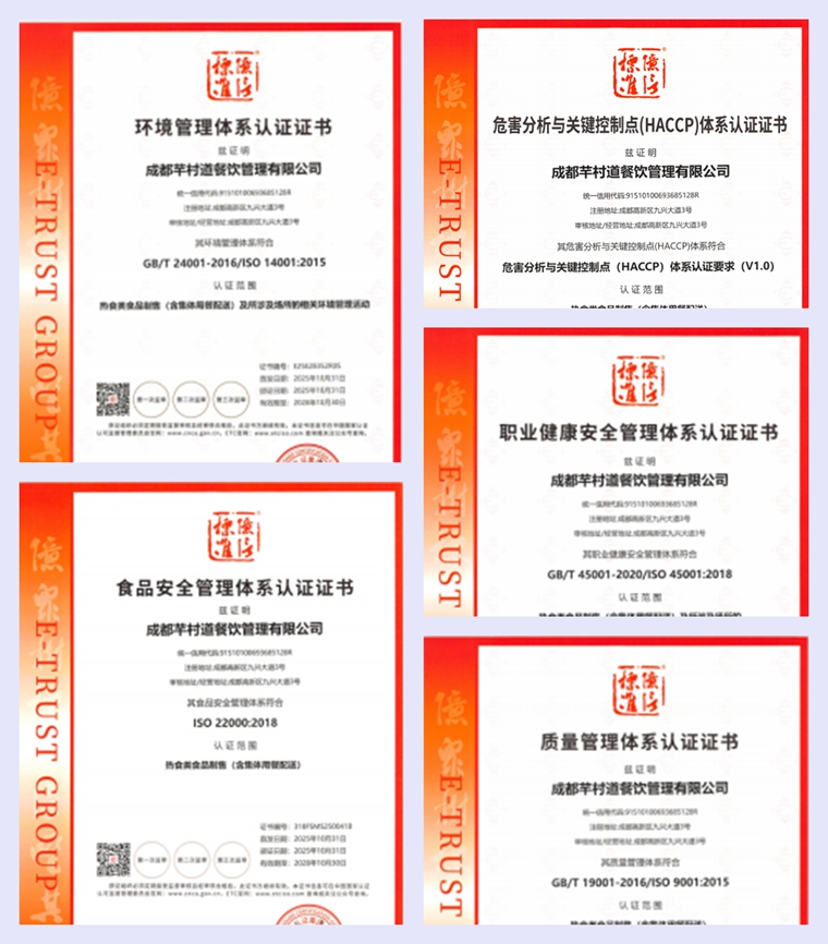 本网讯(周青报道)近日,成都芊村道餐饮治理有限公司(以下简称“芊村道”)凭借严格的治理标准、卓越的产品品质与完善的效劳体系,乐成取得ISO9001质量治理体系、ISO14001情况治理体系、ISO45001职业健康宁静治理体系、ISO22000食品宁静治理体系及HACCP危害剖析与要害控制点体系五概略系认证证书。这五概略系认证作为国际通用的权威标准,涵盖质量管控、情况责任、员工健康、食品宁静等焦点维度,是权衡企业综合实力与合规运营能力的“硬指标”,标记着企业治理水平与运营规范度抵达行业先进水准。
