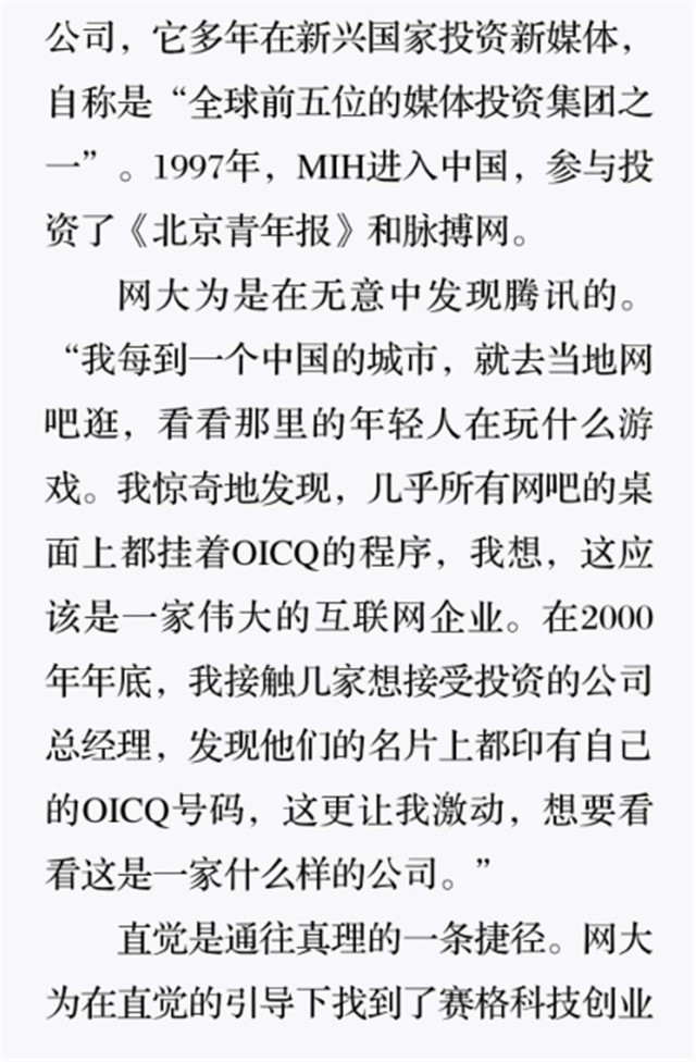 深读之后发明,其实全书真正的焦点在于透过腾讯可以视察到的中国企业逻辑,其中许多基于国情而降生的特殊能力,已往或受诟病或被追捧,而本书作者可以以越发客观的姿态对其进行剖析,这无疑是一种今世创颐魅者和企业家应当学习的姿态和能力。