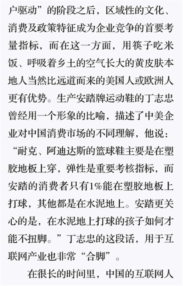 深读之后发明 ,其实全书真正的焦点在于透过腾讯可以视察到的中国企业逻辑 ,其中许多基于国情而降生的特殊能力 ,已往或受诟病或被追捧 ,而本书作者可以以越发客观的姿态对其进行剖析 ,这无疑是一种今世创颐魅者和企业家应当学习的姿态和能力。